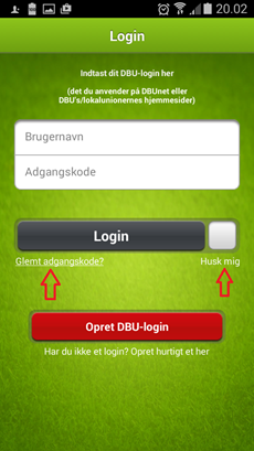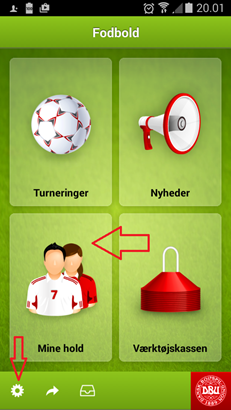 For at udfylde holdkort skal man logge ind i app'en. Det gøres vis tandhjulet nederst til venstre (ved login kan du sætte den til at huske dig, så du ikke skal logge ind hver gang). Det er samme brugeroplysninger som til DBU's øvrige systemer, som f.eks. KlubOffice. Kan du ikke huske dine oplysninger, kan du klikke på "Glemt adgangskode?" i stedet for at logge ind. Se billeder nedenfor.